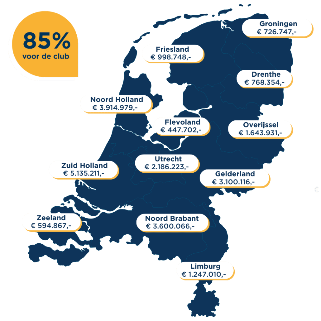 Wij zijn ongelofelijk trots op al die mensen die zich hebben ingezet voor hun club of vereniging. Elk verkocht lot staat voor betrokkenheid, inzet en saamhorigheid. Het is geweldig om te zien hoe leden zich inzetten, van de jongste jeugd tot de meest ervaren vrijwilligers. De groei van dit jaar laat zien dat onze formule werkt: meedoen is simpel, effectief en voor iedereen bereikbaar. Zo houden we samen het verenigingsleven vitaal en toekomstbestendig. En we sloten 2025 af met geweldig nieuws voor alle deelnemende verenigingen: geen 80% maar 85% voor de clubkas!
