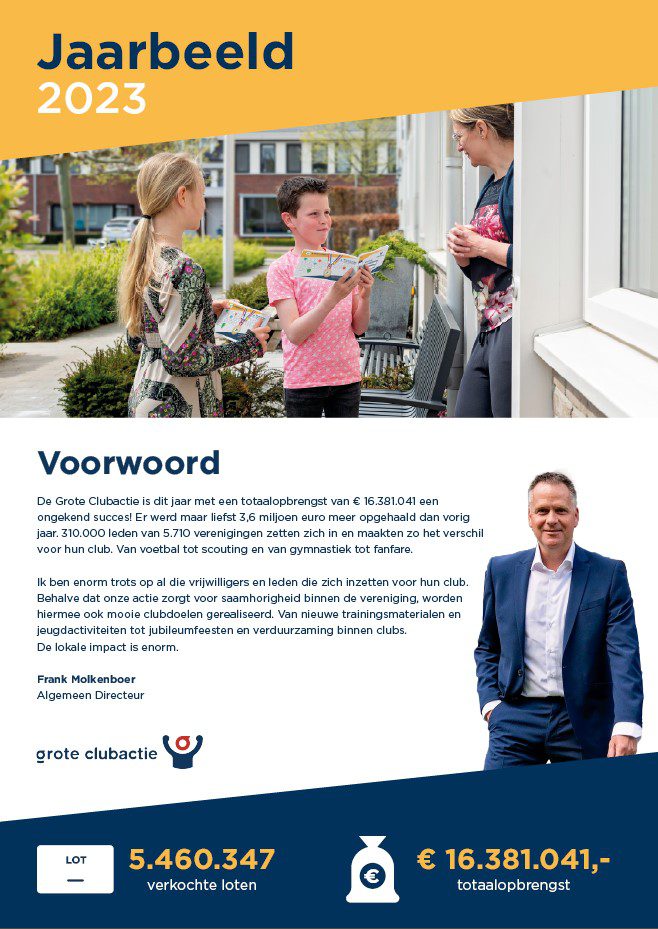 De Grote Clubactie heeft dit jaar opnieuw een recordbedrag opgehaald: €24.363.954,-. Nog nooit eerder werd er zoveel geld ingezameld voor het Nederlandse verenigingsleven. Ook het aantal deelnemende clubs bereikte een nieuw hoogtepunt: ruim 6.500 verenigingen deden mee aan de actie, die al sinds 1972 het fundament vormt onder de clubkas van duizenden sport-, cultuur- en hobbyverenigingen in Nederland.