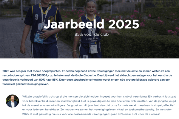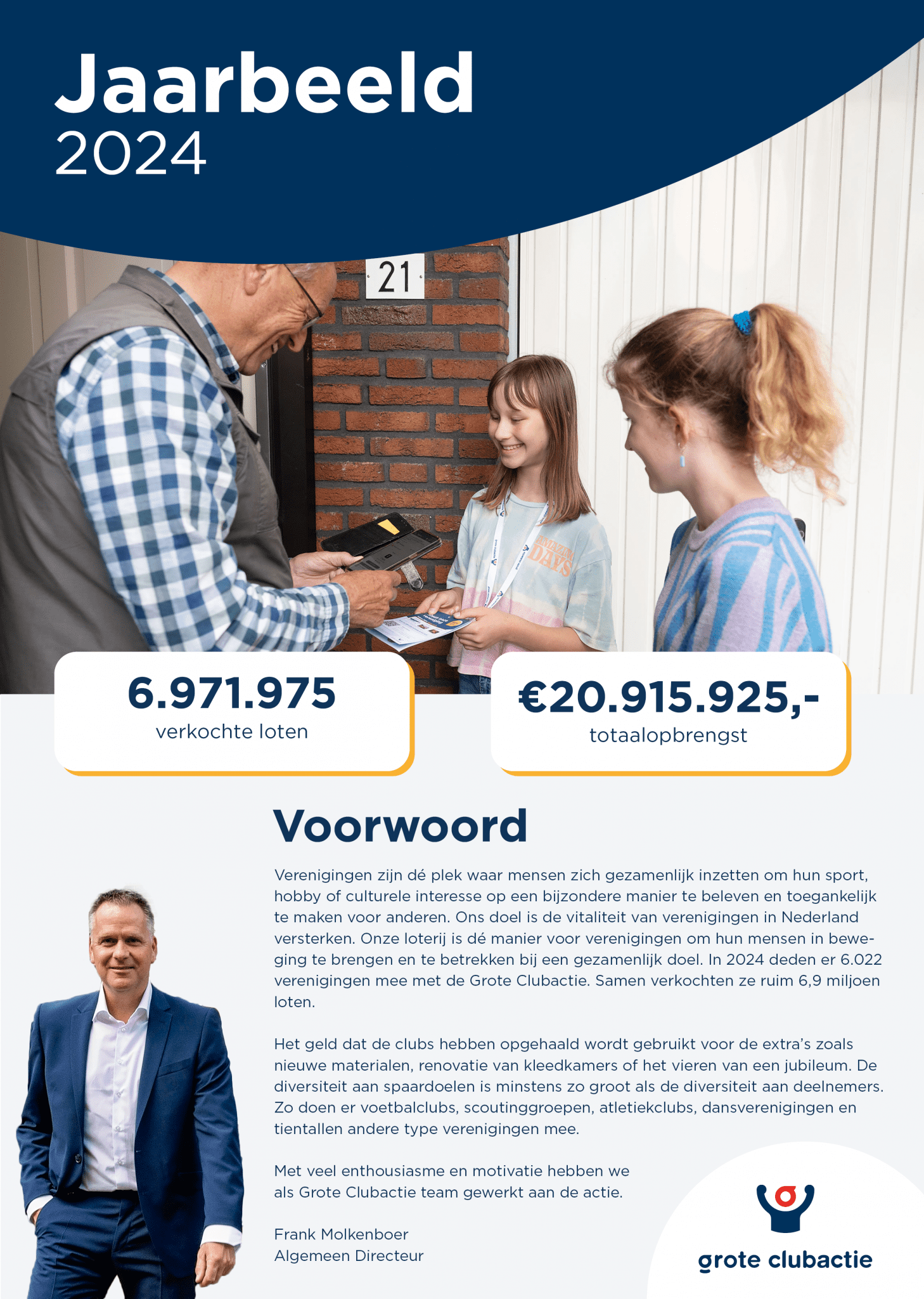 “Verenigingen zijn dé plek waar mensen zich gezamenlijk inzetten om hun sport, hobby of culturele interesse op een bijzondere manier te beleven en toegankelijk te maken voor anderen. Ons doel is de vitaliteit van verenigingen in Nederland versterken. Onze loterij is dé manier voor verenigingen om hun mensen in beweging te brengen en te betrekken bij een gezamenlijk doel. In 2025 deden er 6.523 verenigingen mee met de Grote Clubactie. Samen verkochten ze ruim 8 miljoen loten.”