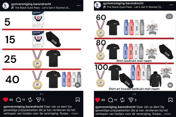 Om leden extra te motiveren bedacht de vereniging een leuke winactie. Hoe meer loten je verkoopt, hoe meer prijzen je verdient. Al vanaf 5 verkochte loten werd je in het zonnetje gezet en verkocht je 100 loten? Dan ging je er met het volledige pakket aan prijzen vandoor.